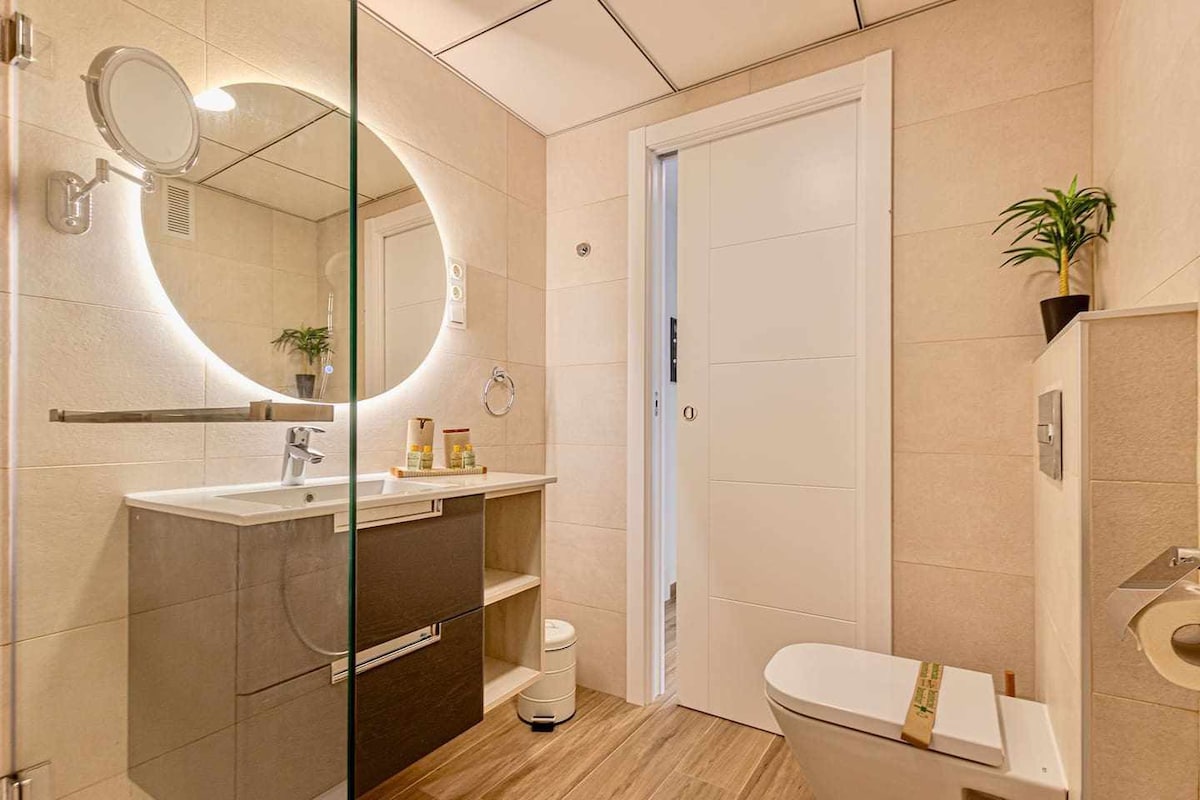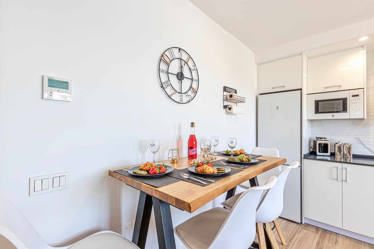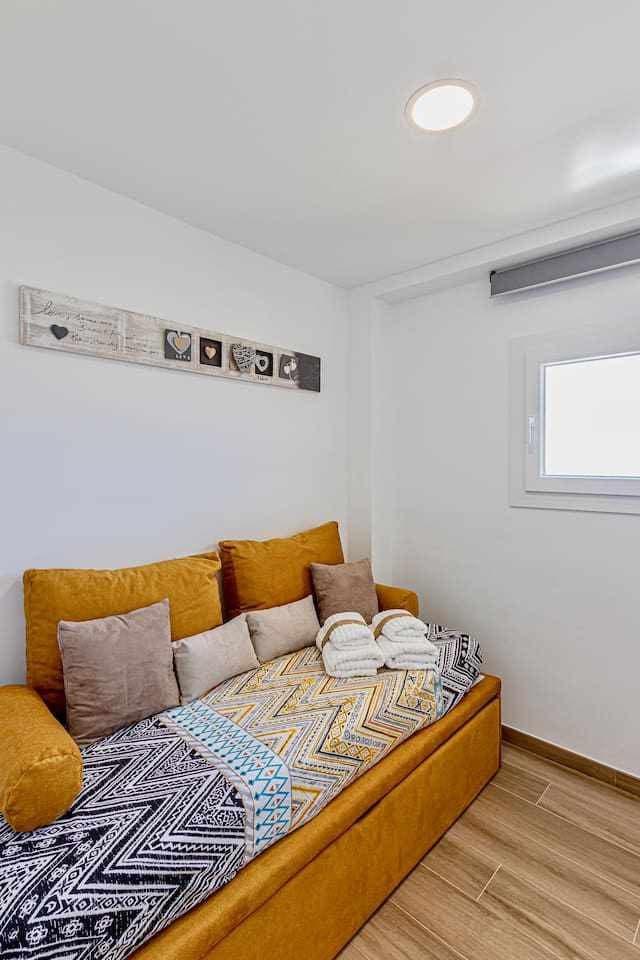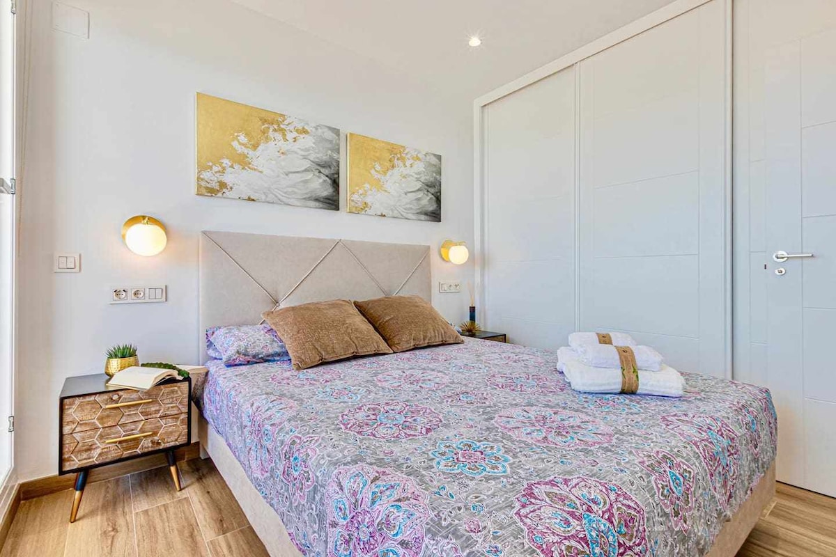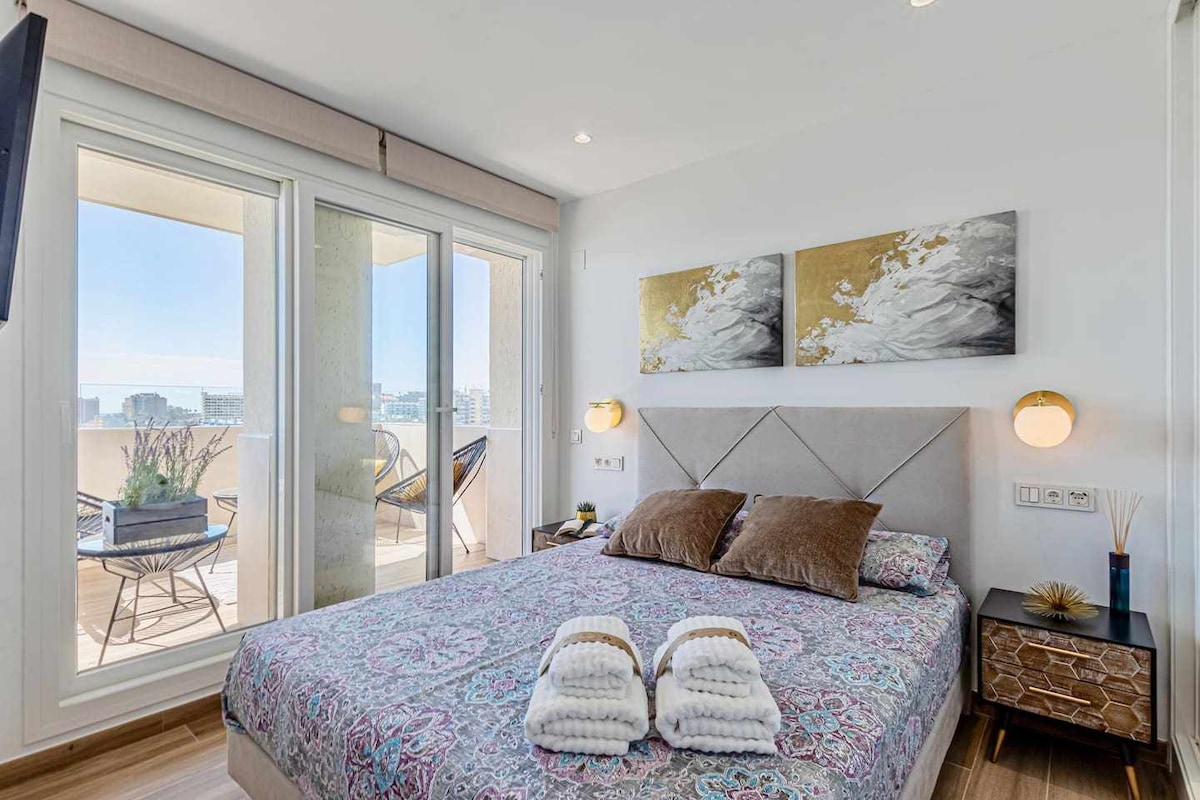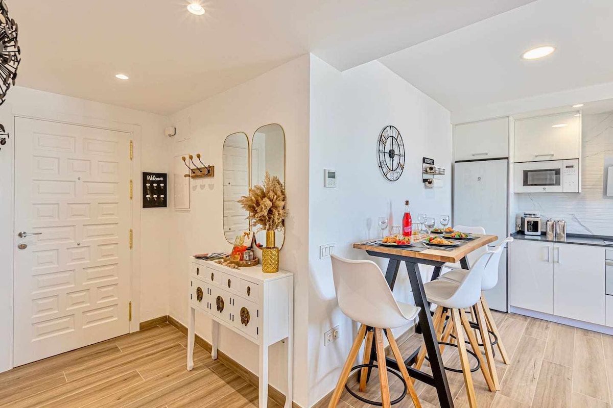 Cuenta con un baño totalmente nuevo con ducha tipo lluvia, 1 habitación matrimonial con armarios empotrados, vista al mar y acceso a la terraza, una segunda habitación pequeña con dos camas individuales, y un salon- comedor- cocina, con comedor alto tipo barra, la cocina totalmente equipada para tu estancia con Nevera y congelador, microondas, horno, vitroceramica, y todos los electrodomésticos y utensilios de cocina necesarios.